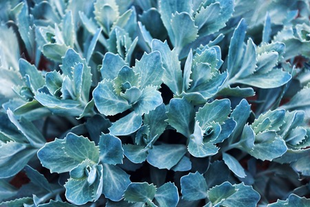 Green leaf background. Processing under the film in cold colors. Helichrysum petiolare, silver-bush everlastingflower. Asteraceae family