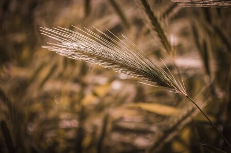 One brown spikelet in the field. There are others, but there is something special about this spikelet. Photo with one main subject and bokeh background.
