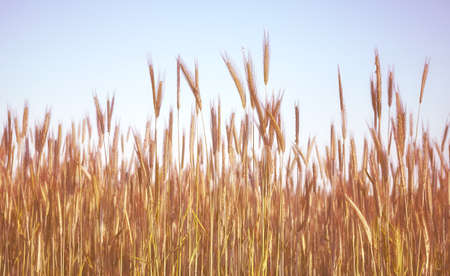 Rye field or crop field with ripe cereal plants in the golden sunlight. Selective focus on the foreground.
