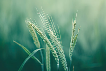 Close up on young green wheat ears on a beautiful field. Ripening ears wheat. Agriculture. Natural product.