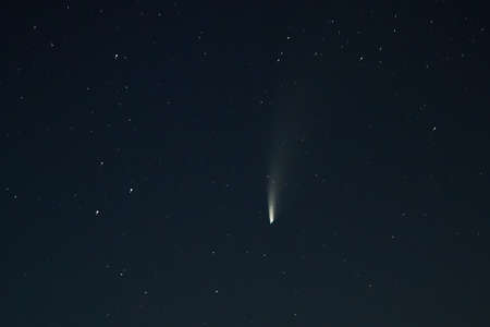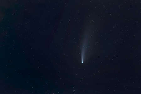 New comet Neowise C / 2020 F3 soars between the stars in the dark night sky. Space objects and a wide panoramic view of the countryside