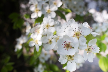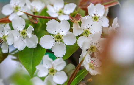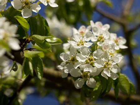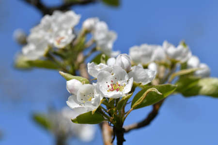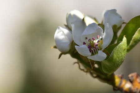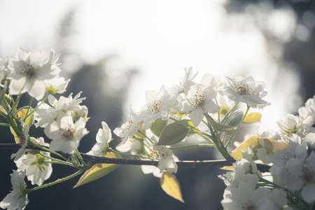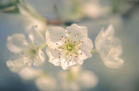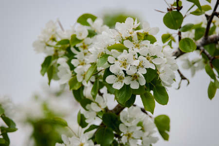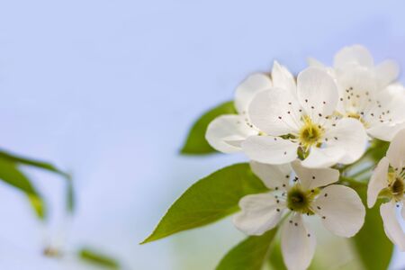 White apple tree branch close up. Apple tree flowers blossom in spring. White apple branch bloom on sky background