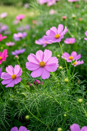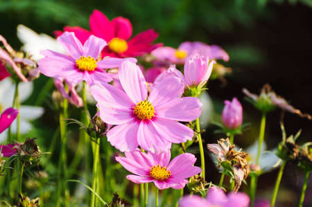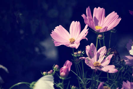 beautiful last autumn flowers in the garden illuminated with the morning sun with dew drops