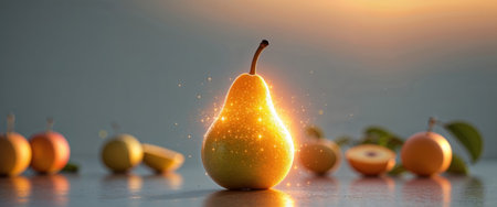 AI Generated. A cheerful glowing pear stands out among ordinary fruits on a reflective surface at sunset