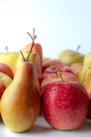 Ripe, juicy pears and apples close-up stand in rows on a white background.