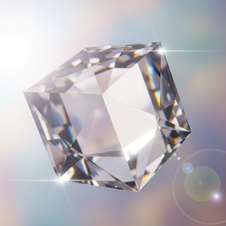 A close-up of a sparkling diamond cube showcases its multifaceted design. The image features brilliant white and clear surfaces reflecting light against a soft, blurred background. Ideal for use in advertisements, presentations, or website content related to luxury goods or abstract concepts.