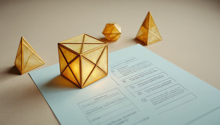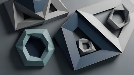 A captivating arrangement of geometric shapes featuring metallic finishes that reflect light beautifully, perfect for modern design projects or artistic endeavors.