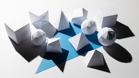 A collection of white geometric paper sculptures, including cubes, pyramids, spheres, and more complex polyhedra, are artfully arranged on a vibrant blue triangular surface. The composition is illuminated by a strong light source, casting distinct and dramatic shadows that add depth and dimension to the scene. The clean white background and the interplay of light and shadow highlight the precise forms and intricate folds of the paper creations, creating a visually striking and minimalist...