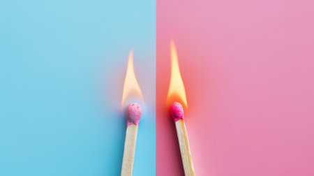 Two burning matches on split pastel blue and pink background, ideas, emotional burnout, teamwork. Generative AI.