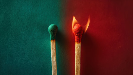 Two burning matches on split green and red background, ideas, emotional burnout, teamwork. Generative AI.