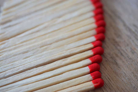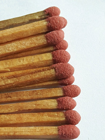 a pile of matches close up on a white table. Macro fire igniter on blurred background. top view.