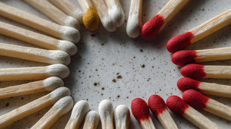 This striking image features matchsticks arranged in a circular formation, showcasing a vibrant contrast in colors and textures. The composition highlights craftsmanship and simplicity.