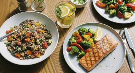 Grilled salmon fillet and colorful quinoa salad with fresh vegetables, served on a rustic wooden table with lemon water. a balanced and nutritious meal.