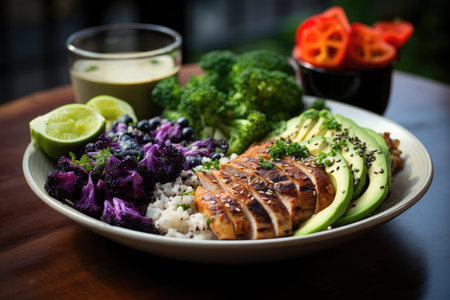 Vibrant fitness dish with quinoa, chicken, avocado and purple smoothie., generative AI