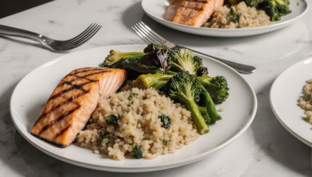Grilled salmon served on white plates with quinoa and broccoli; a healthy, balanced meal
