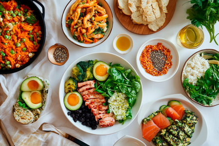 A vibrant array of healthy dishes fills the table, featuring salads, grilled salmon, grains, and colorful vegetables. Friends gather around, enjoying a delightful culinary experience together.