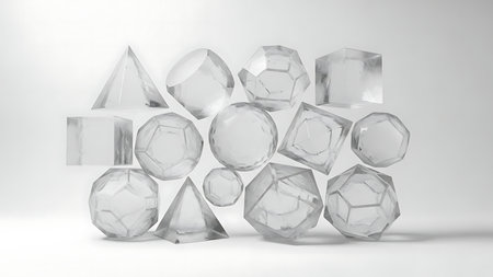 Collection of clear geometric shapes including cubes pyramids and spheres arranged in a cluster