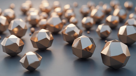 A variety of geometric shapes, including spheres, cones, and polyhedra, scattered across a smooth surface. Warm light highlights their metallic hues, adding depth and intrigue to the arrangement.
