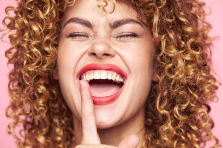close-up of a healthy young blond woman with a Hollywood smile on a blue background