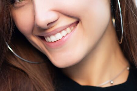 Close up of beautiful smile of young woman with white healthy teeth.