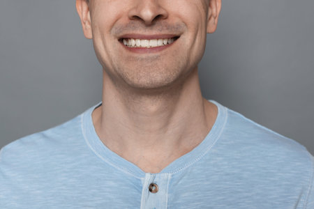 Toothy smile of young man. Close-up view of white teeth.