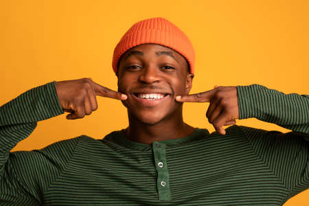 Dental Care. Happy Smiling Black Hipster Guy Pointing At His White Teeth