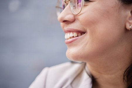 Dental hygiene, smile and teeth of a woman for closeup on happiness, motivation and positive mindset. Zoom, face and mouth of a happy female person with cosmetics, confidence and wellness profile