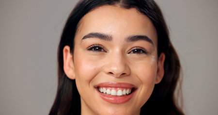 Beauty, happy and portrait of woman in studio for cosmetics, wellness and skincare. Dermatology, mockup space and face of person with smile for natural texture, glow and shine on gray background