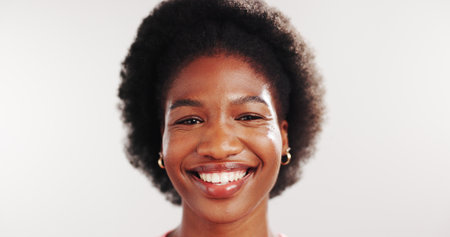 Beauty, smile and portrait of black woman in studio for skincare, glow and self care aesthetic. Happiness, shine and dermatology mockup space with female person on white background for clear skin