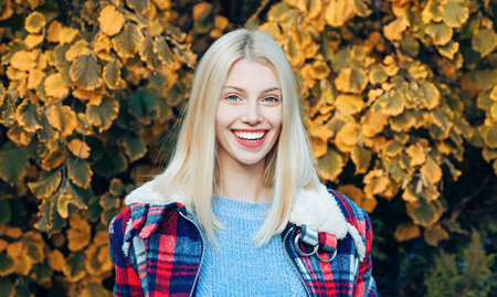 Autumn face of happy young woman. Smiling woman on autumn fall background. Beauty girl with fall leaves. Autumn model with fall maple leaf. Autumn portrait of beautiful happy girl.