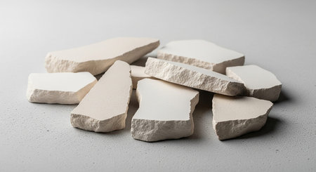 A pile of irregular white and beige ceramic shards scattered on a gray surface. Clear details and vibrant colo...