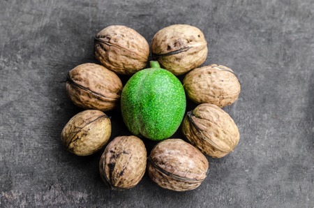 Textured peeled walnuts around one green