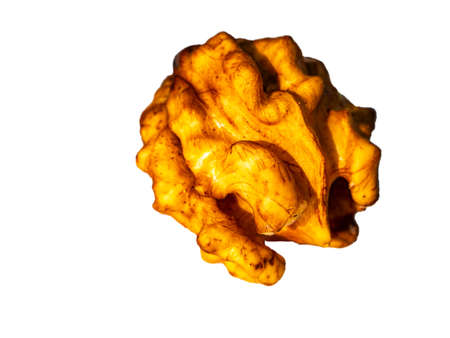 Chopped walnut fruit on a white background. Walnut kernel. The shell is cracked. Harvesting garden crops. Isolated on white background. Background image. Place for your text. Shop window. Poster.