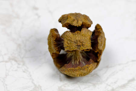 One cypress cone, which is dry, is shown on a marble background