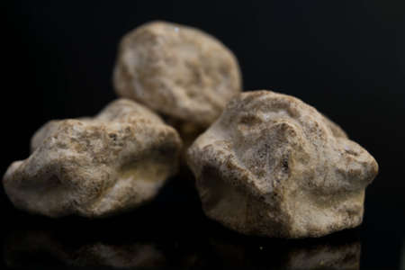 Raw amber from the shores of the Baltic Sea. Pieces of raw amber lie on black glass. Raw material for the production of jewelry.