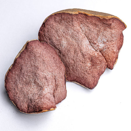 Heap of processed areca nuts cut in half revealing deep orange brown radial internal structure and dry exterior