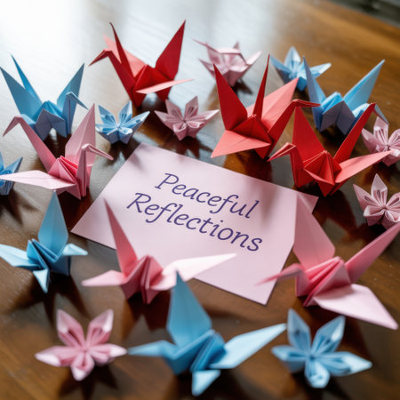 Peaceful Reflections: Origami Cranes and Flowers on a Wooden Surface
