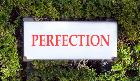 Perfection symbol. Concept word Perfection on beautiful white marble sign plate. Beautiful green leaf background. Business perfection concept. Copy space.
