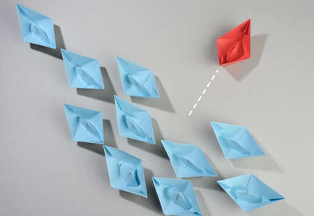 group of paper boats on a gray background. The concept of thinking outside the box, uniqueness. To act contrary to generally accepted norms