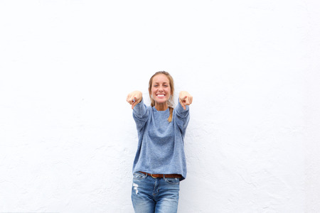 Portrait of happy young woman pointing fingers