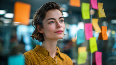 A young woman stands in a bright office, gazing at vibrant sticky notes on the wall. Her thoughtful expression reflects creativity and inspiration in a collaborative workspace.