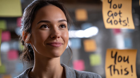Smiling Young Woman Surrounded by Colorful Sticky Notes, Showcasing Positive Energy and Creativity