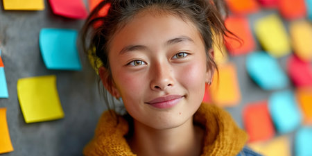 Smiling Asian girl in modern classroom with colorful sticky notes, showing creativity and joy.