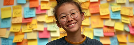 Cheerful Asian Teenage Entrepreneur Student with Glasses in Classroom with Colorful Sticky Notes