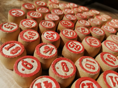 Wooden counters of bingo with red digits