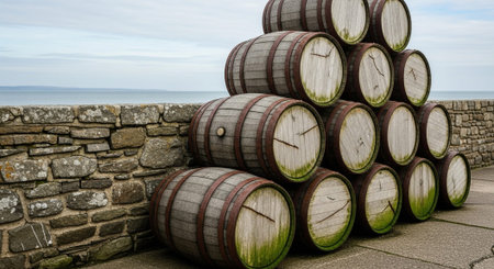 Close-up of a stack of whisky Barrels. Generative AI