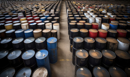 A conceptual photograph featuring chemical drums arranged in a visually appealing pattern, emphasizing their shapes and colors. --ar 3:2 --v 6 Job ID: d770404b-86a3-496f-8271-f498e9b0330f
