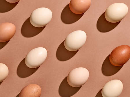 Eggs of different shades of brown lie in a gradient color on a light gray background, flatlay