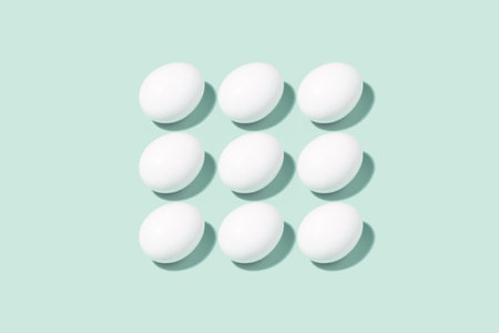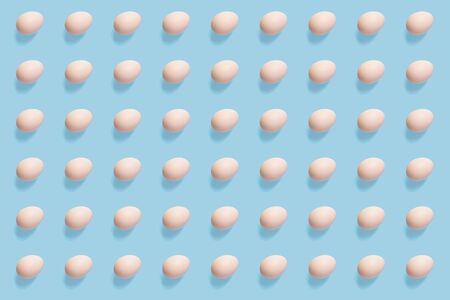 Pattern from White chicken eggs on yellow background top view flat lay copy space. Creative food minimalistic background, Easter. Natural healthy food and organic farming concept