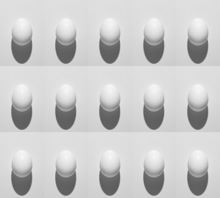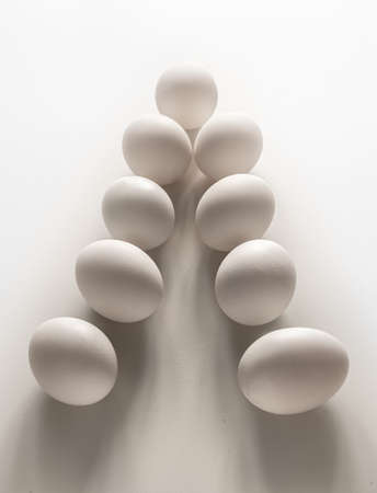 Top view 20 chicken eggs on a white table. Concept for poultry farm, production of eggs for shops.Healthy foods and farming. Eggs in cells box.